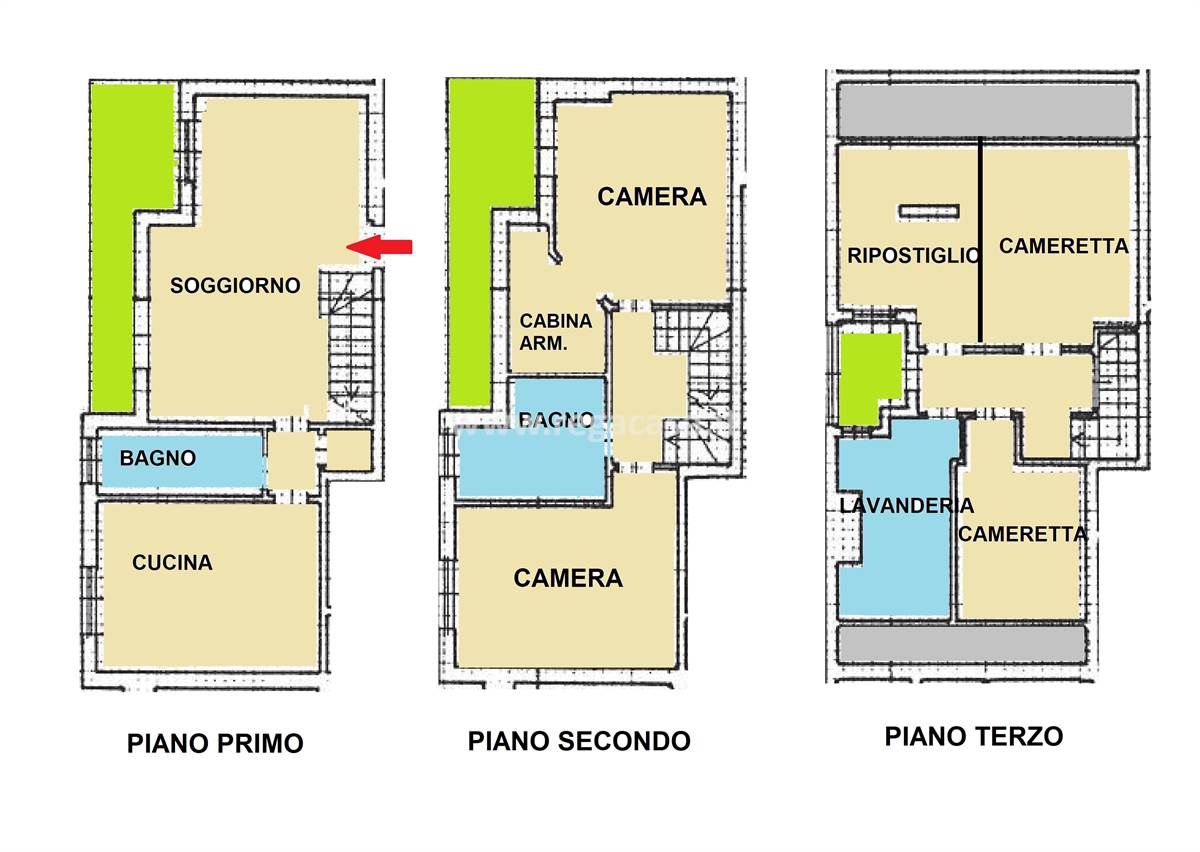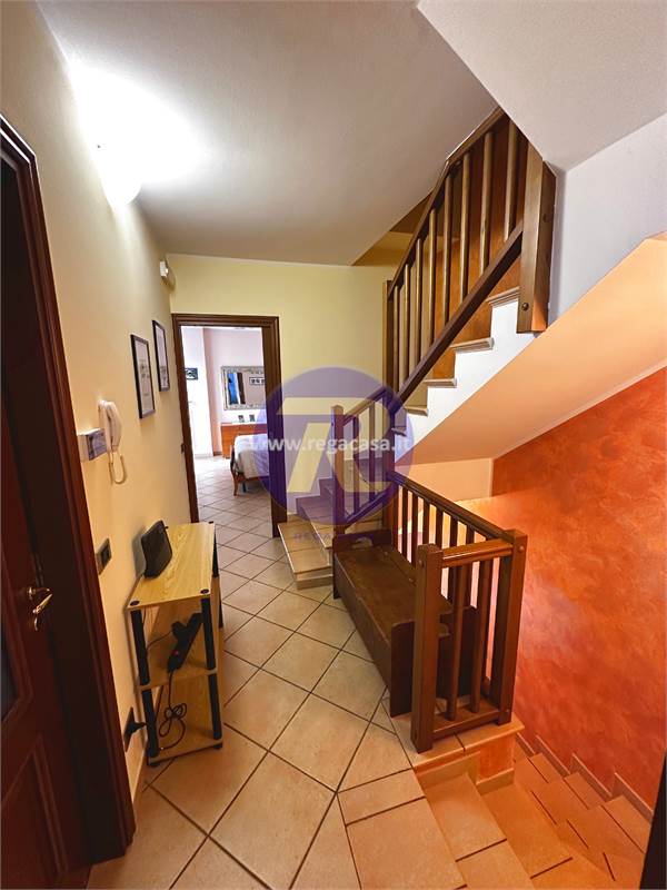 Piano primo: ingresso nel soggiorno con balcone panoramico e scala interna di collegamento ai piani superiori, cucina abitabile, disimpegno, bagno di servizio e ripostiglio;