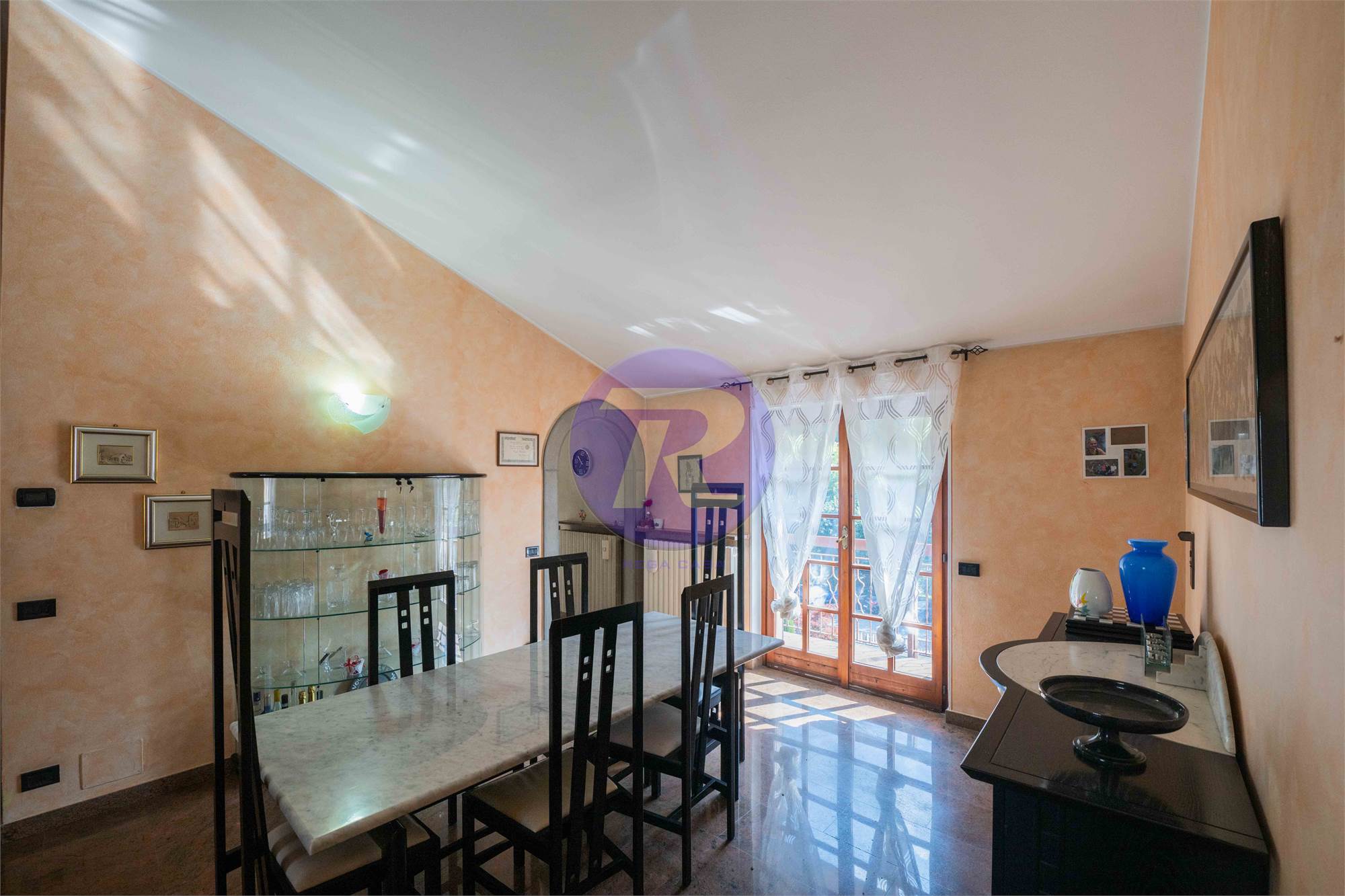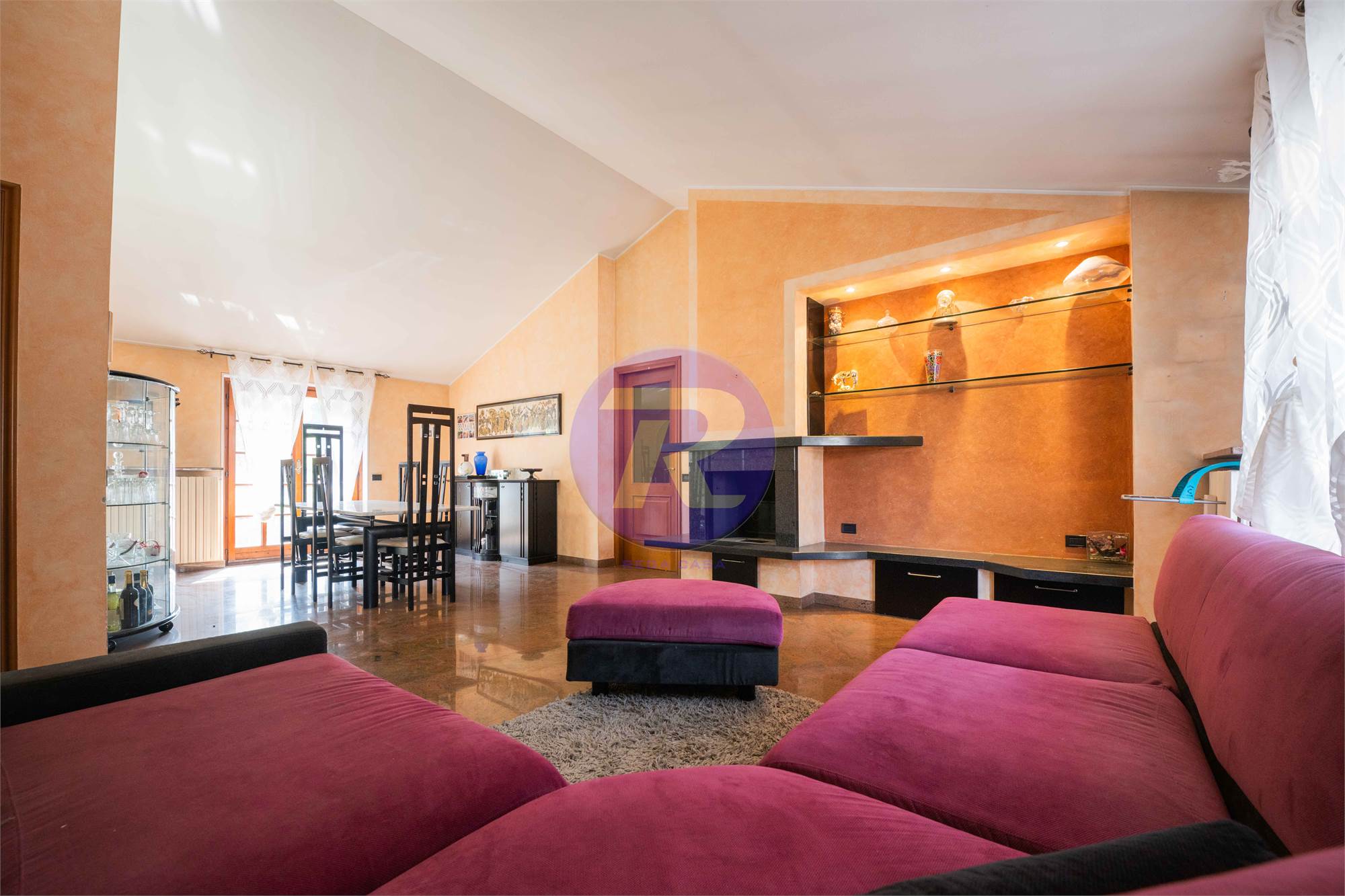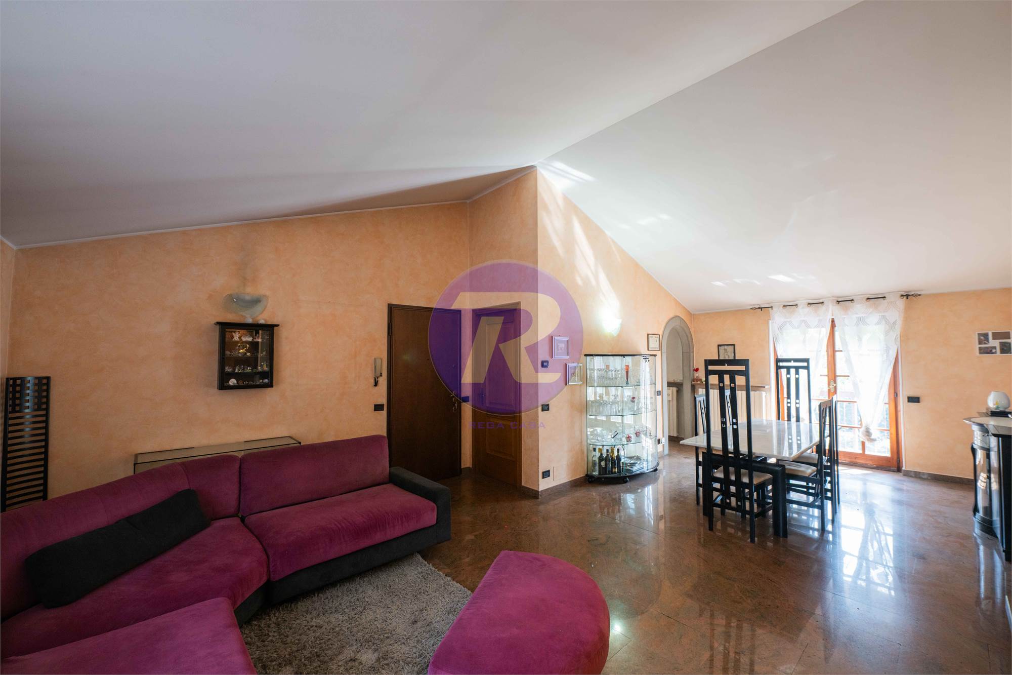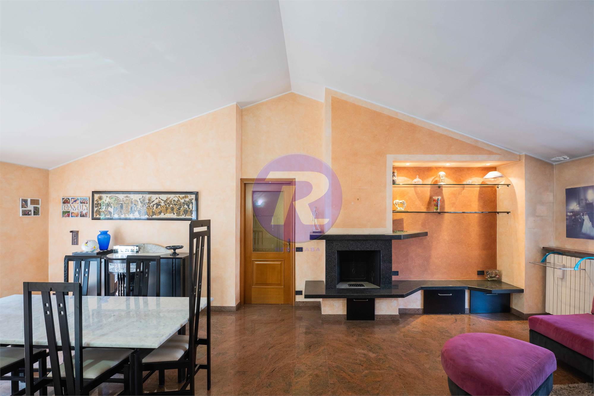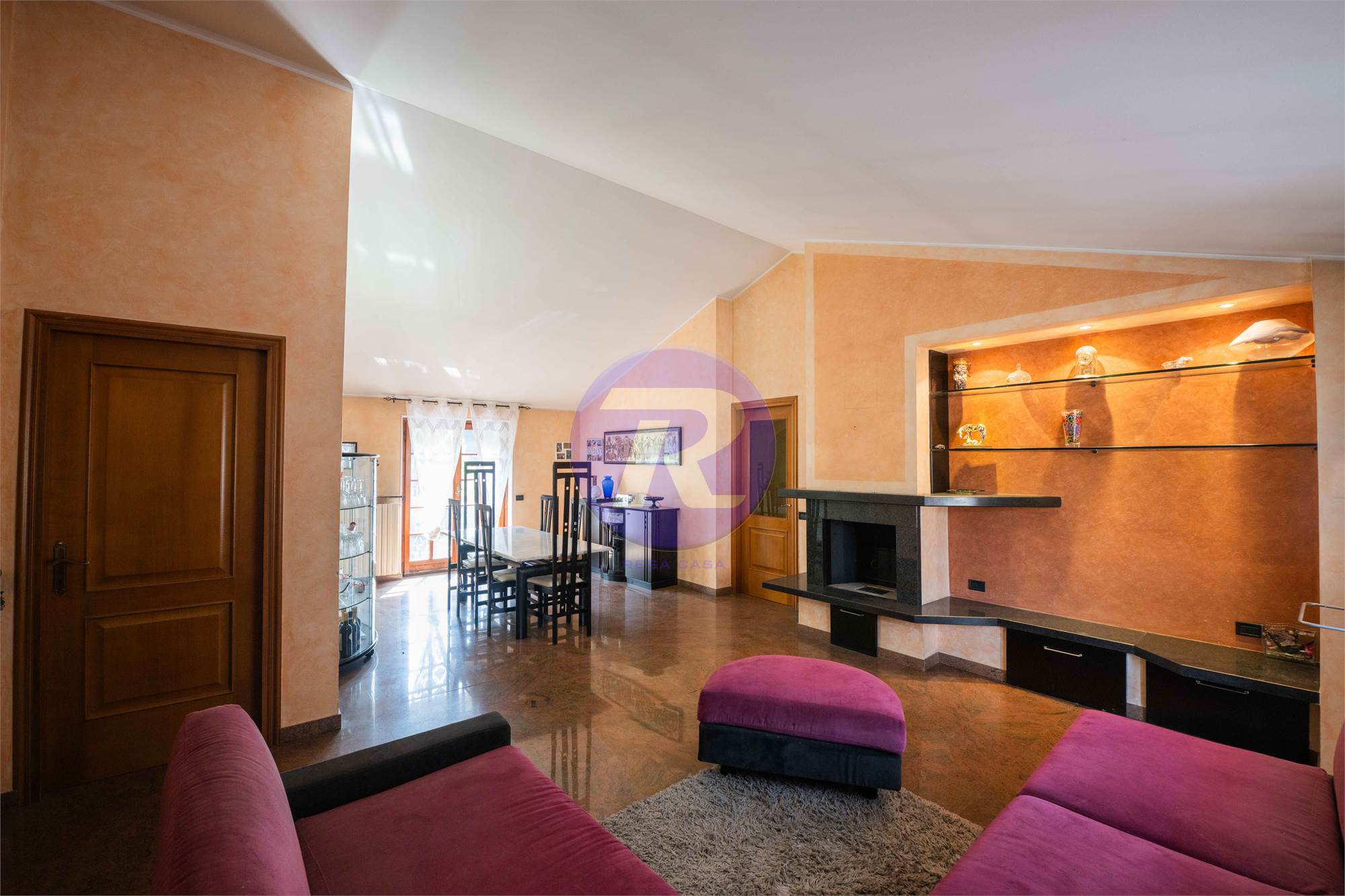 Soggiorno di ampie dimensioni con camino e zona pranzo, con accesso diretto al terrazzo