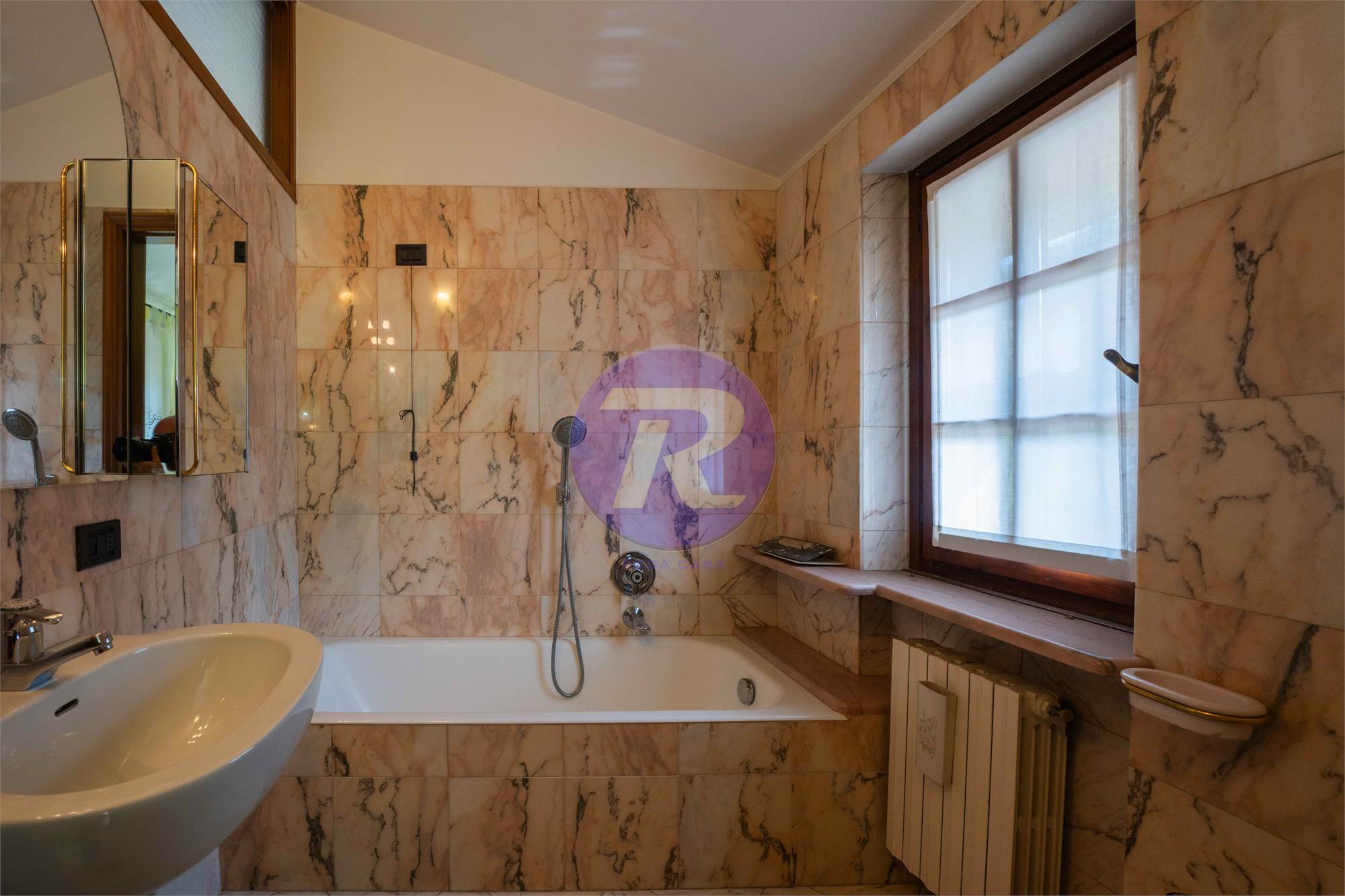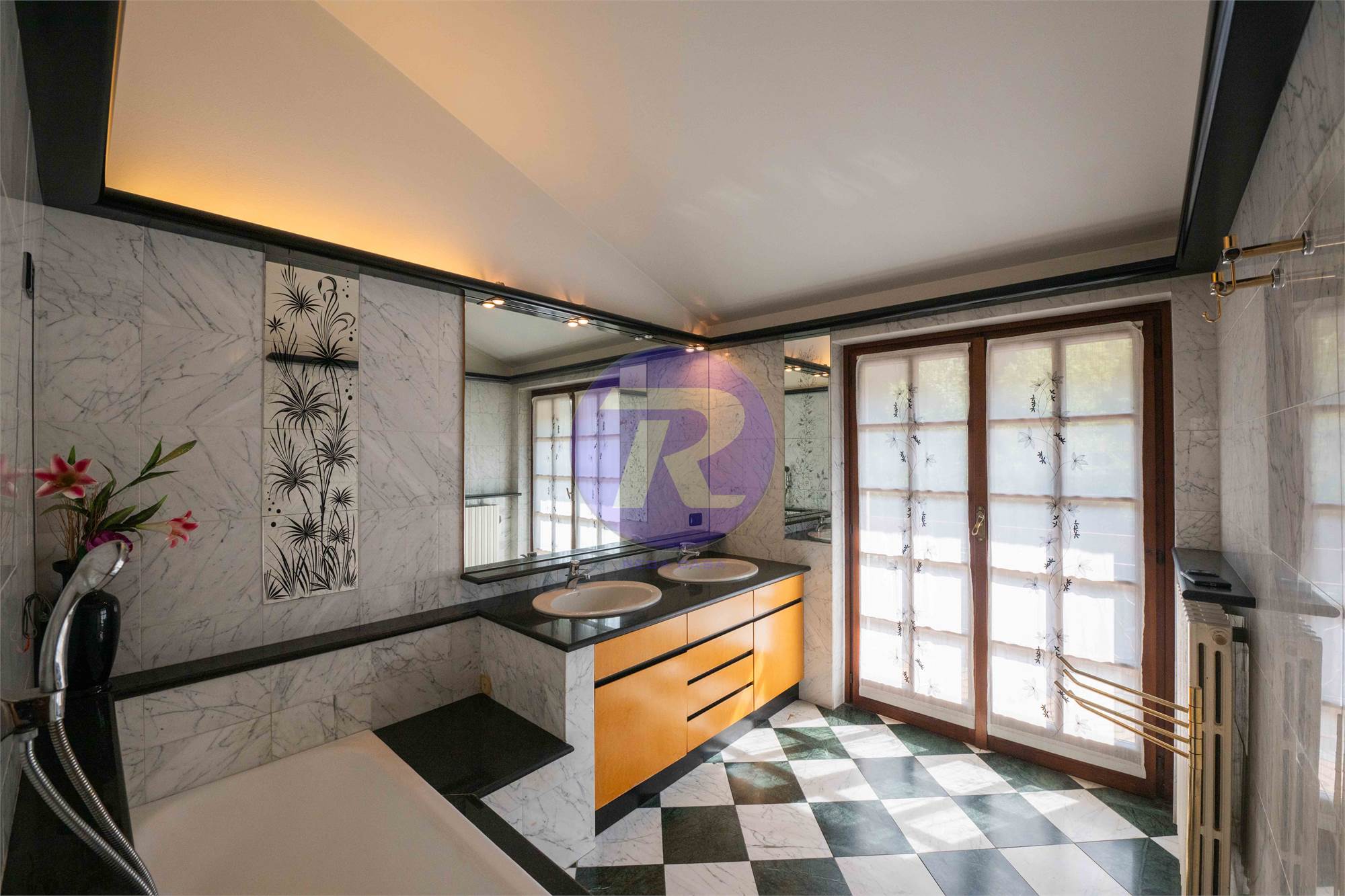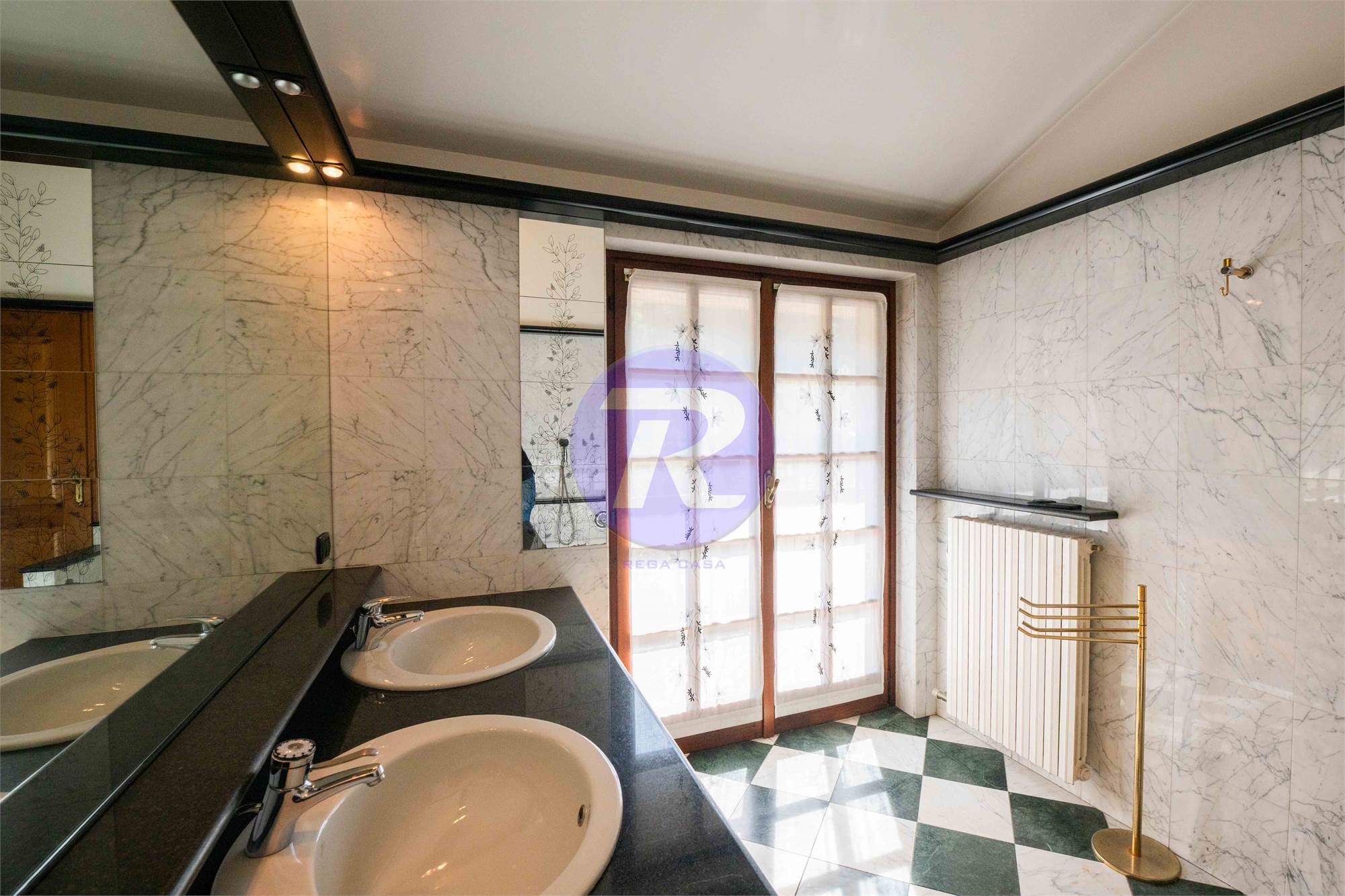 Secondo bagno finestrato, completo di doppi lavandini, vasca e doccia separati