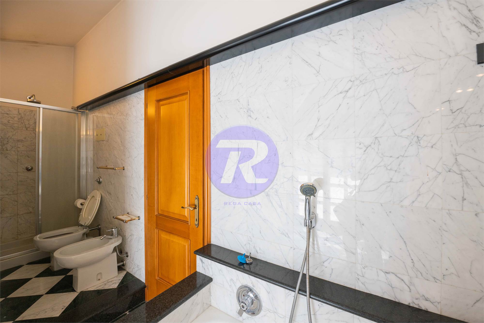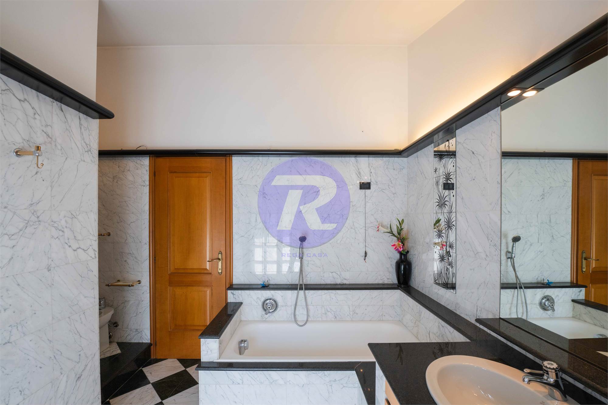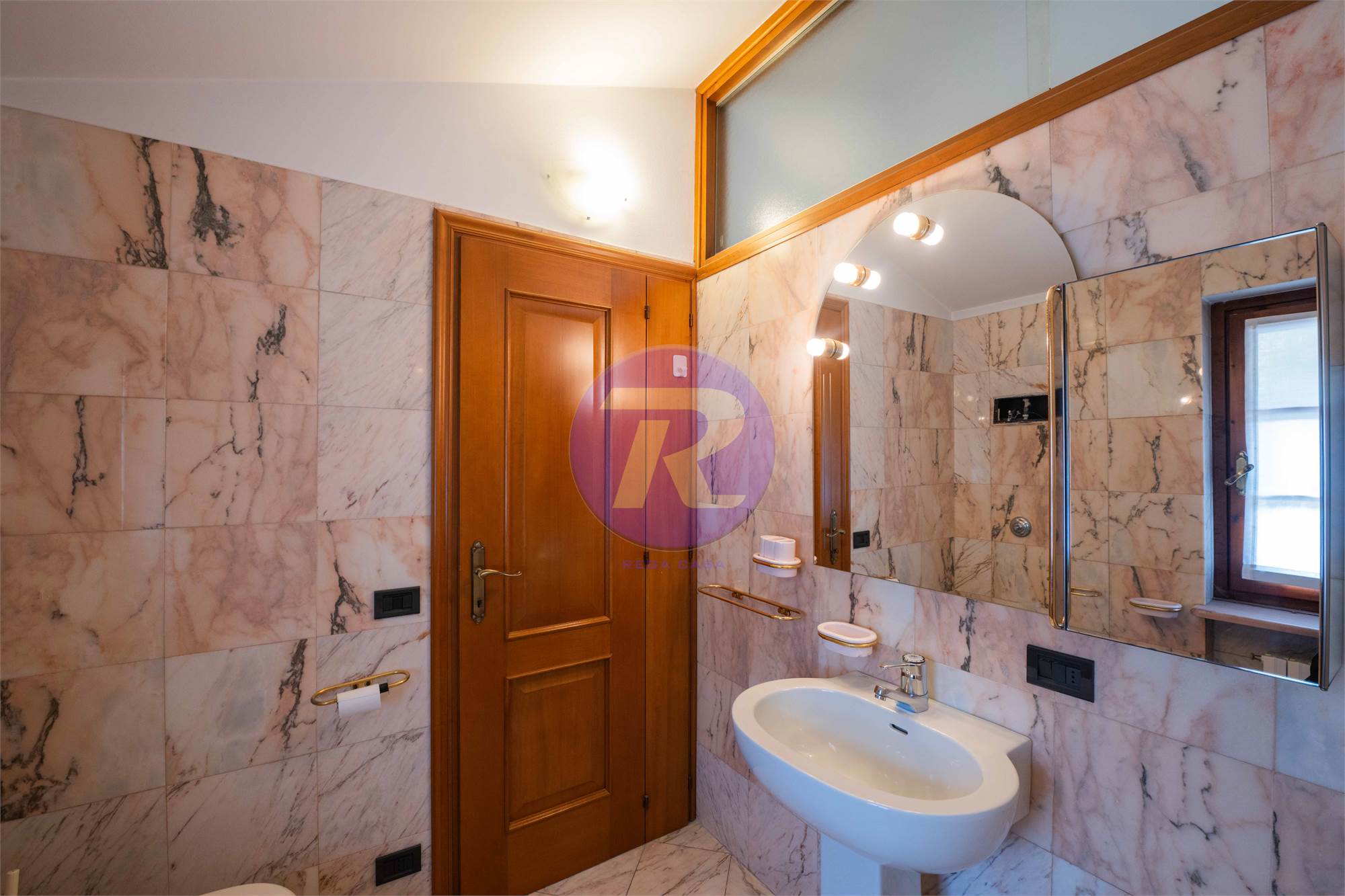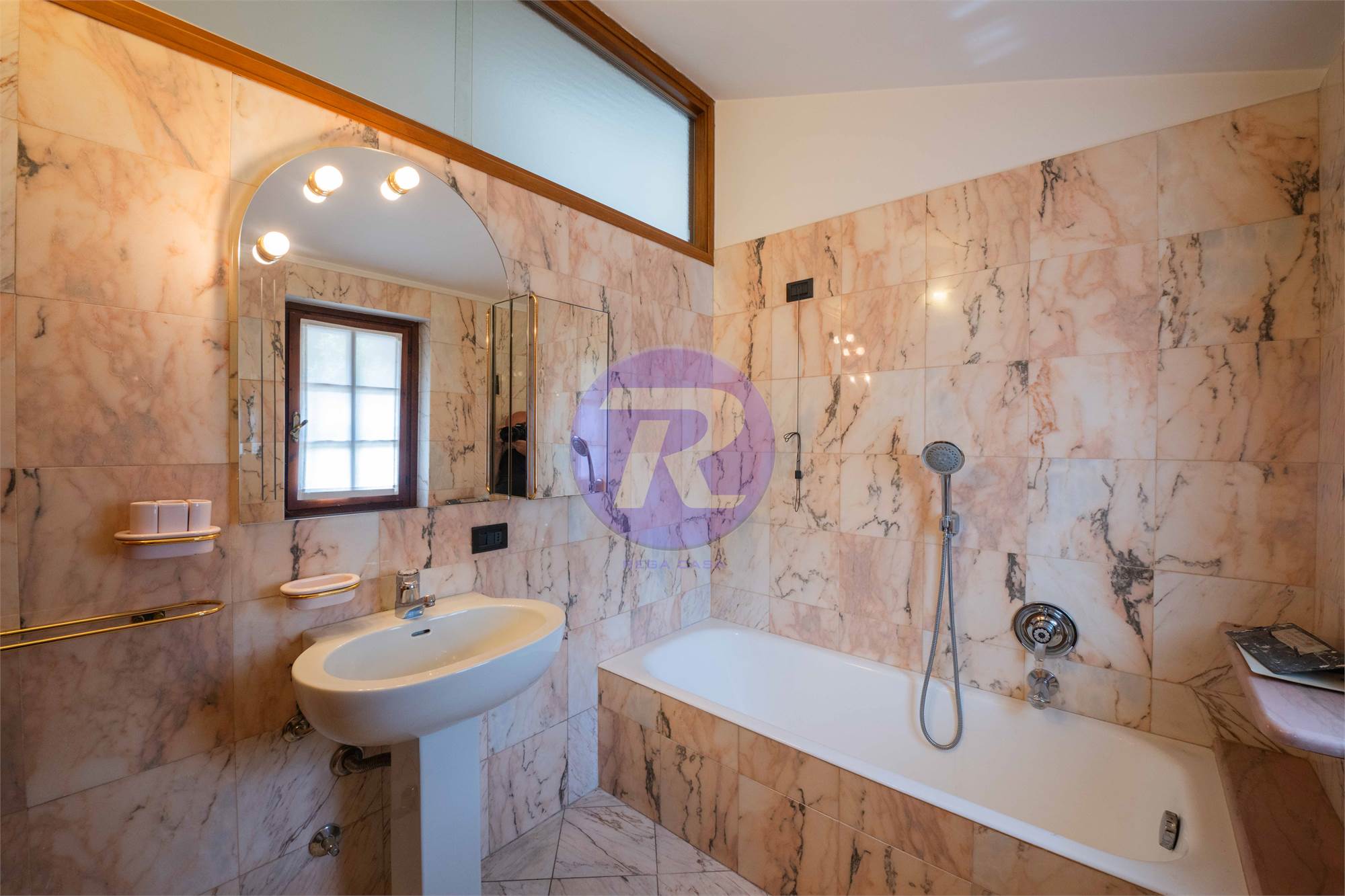 Secondo bagno finestrato, completo di doppi lavandini, vasca e doccia separati